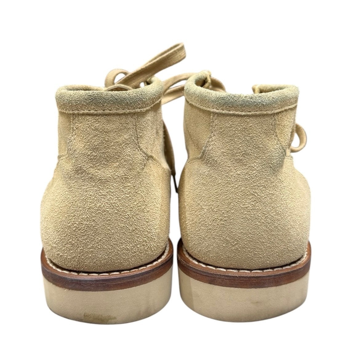 備考  キメの細かい良質な吟付き牛スエードを使用したショートブーツ。縫い合わせ部分から水の侵入を防ぐようかぶせるように覆って縫い合わせるモカ部位は1点1点丁寧に職人の手縫いでつくられており製法には耐久性、安定性に優れたグッドイヤーウェルト製法を採用。履き込む程に足に馴染み、ソールの張替えも容易に。アウトソールにはヒールまで一体型のVIBRAMソール。柔らかく軽量で長時間の使用でも疲労度が少なくスニーカーに近いような履き心地が特徴です。参考定価:63,800円(税込)※箱あり。青い薄汚れ、両足ソール若干減っておりますので完璧を求めるかたや古着にご理解ないかたはご購入をお控えくださいませ。