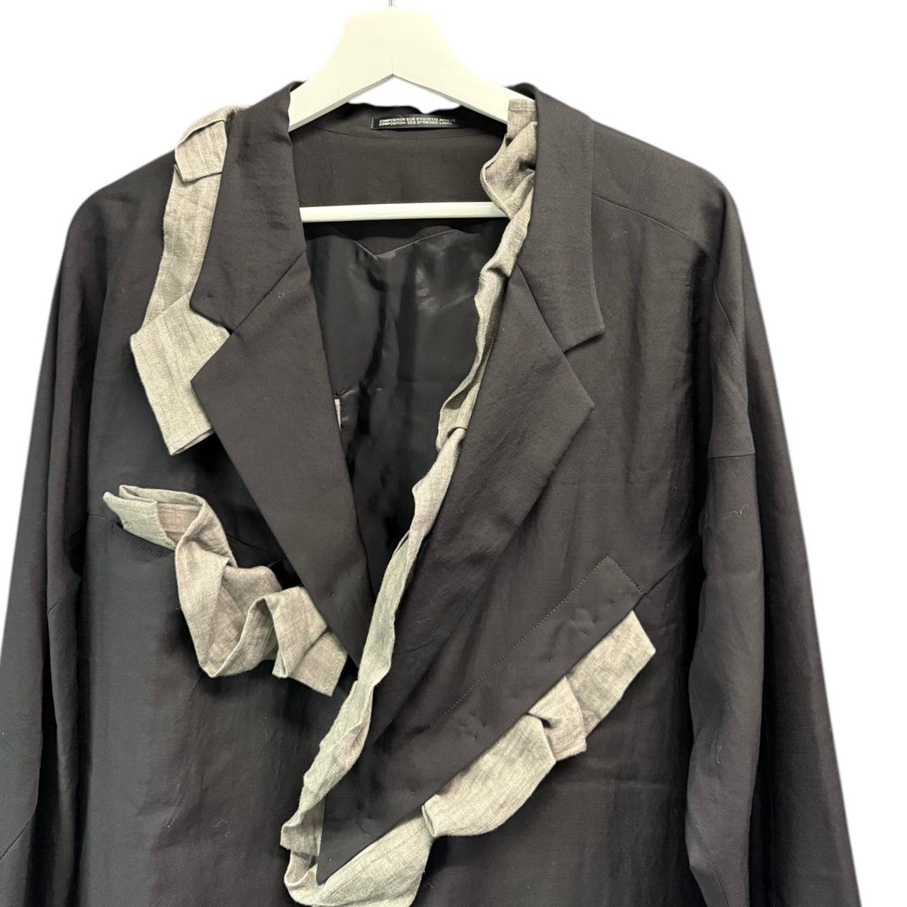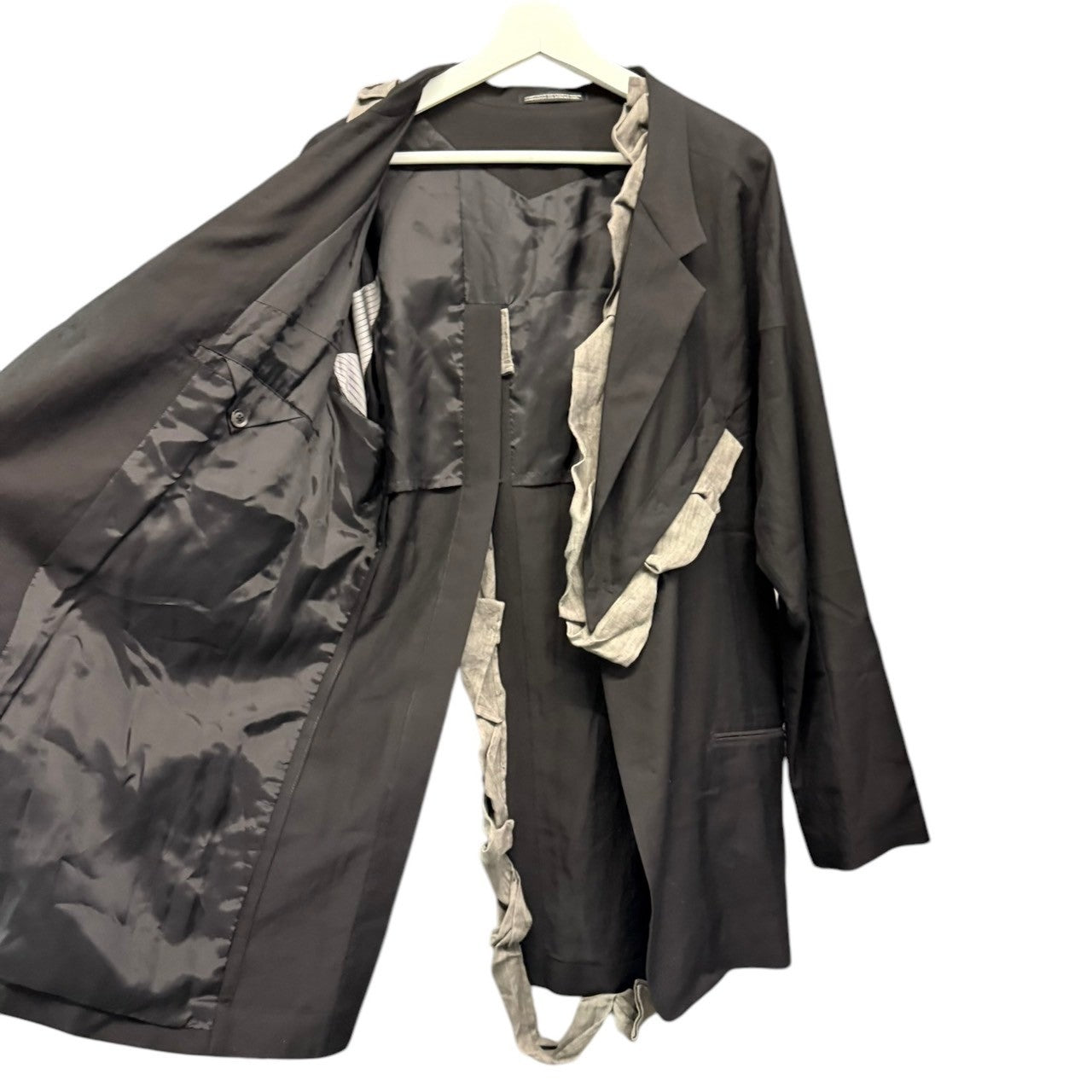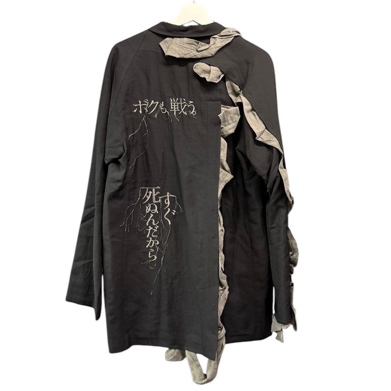 備考  左右非対称の構造線を利用してグレー色の生地をドレーピングで留め、構造線からフリルのはみ出し方や見え方が均一にならないように強弱を付け、タックの寄せ方をあえて変えているのが魅力的です。背中には刺繍でメッセージを添えたスペシャルな一着です。参考定価:359,700円(税込)※目立った汚れはございませんが完璧を求めるかたや古着にご理解ないかたはご購入をお控えくださいませ。
