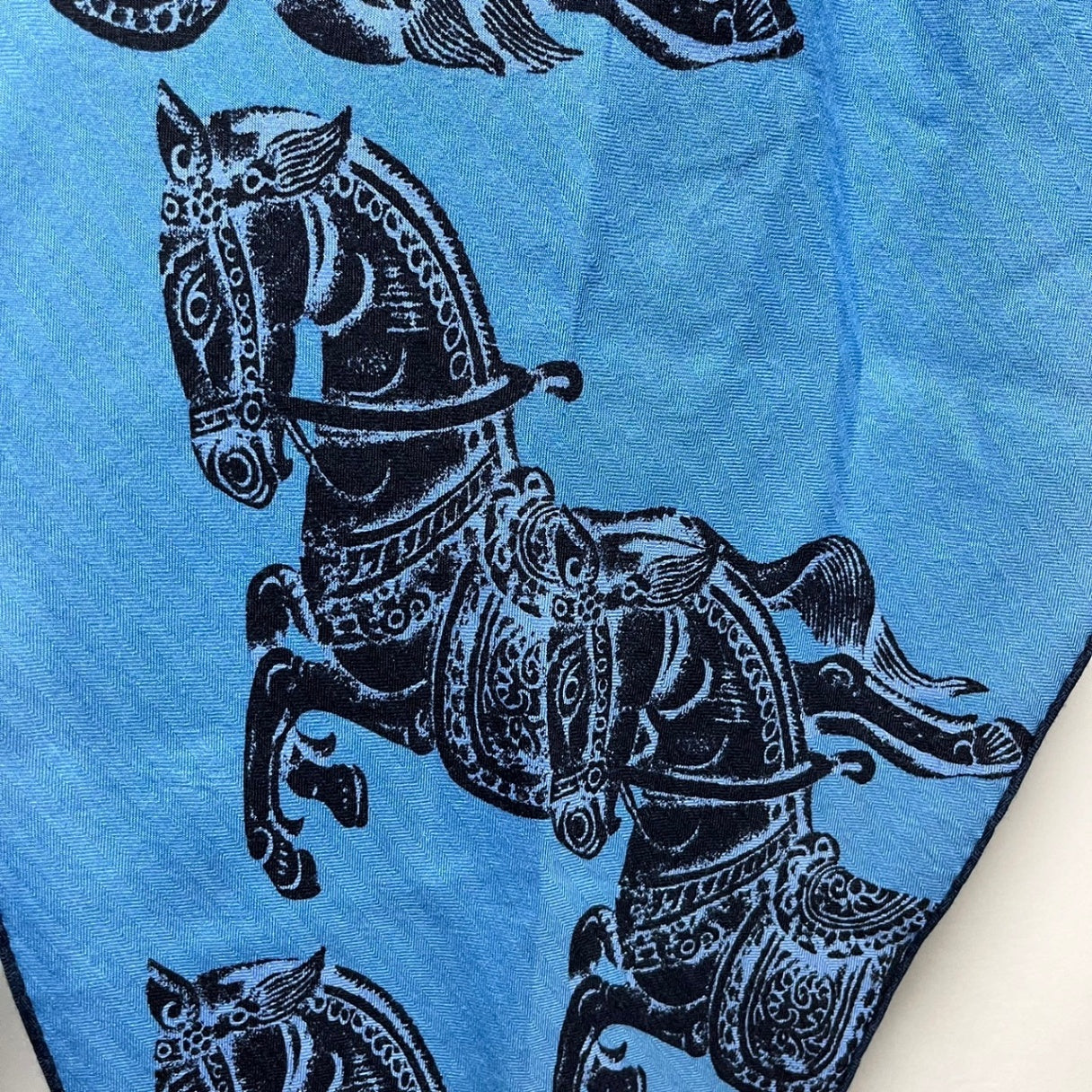 備考  上質なカシミヤとシルクを混合したひし形が特徴的なスカーフ。ホースプリントがエルメスらしい一枚です。