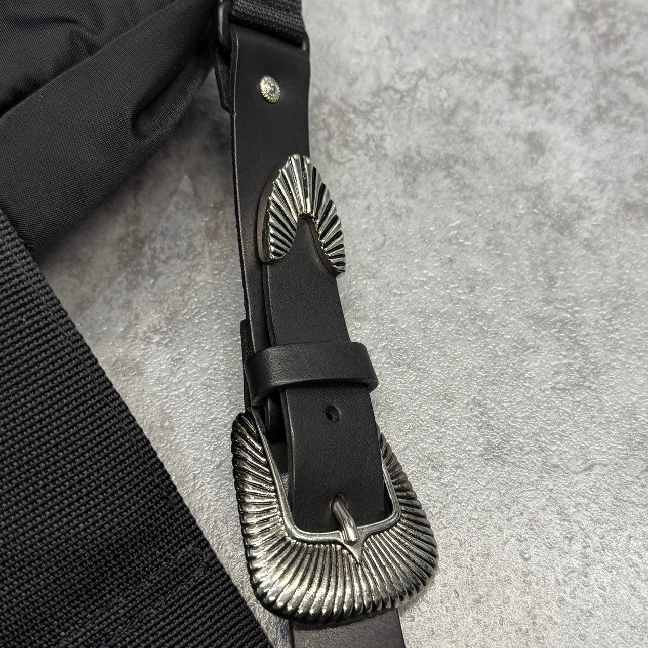 備考  フロントの太いレザーベルトに手を通せばクラッチバッグになる大きなポーチと、小さなポーチをドッキングした。デザインにはウエスタン要素、メタル使いといったTOGAらしいデザインがクールです。参考定価:41,800円(税込)※目立った汚れはございませんので完璧を求めるかたや古着にご理解ないかたはご購入をお控えくださいませ。
