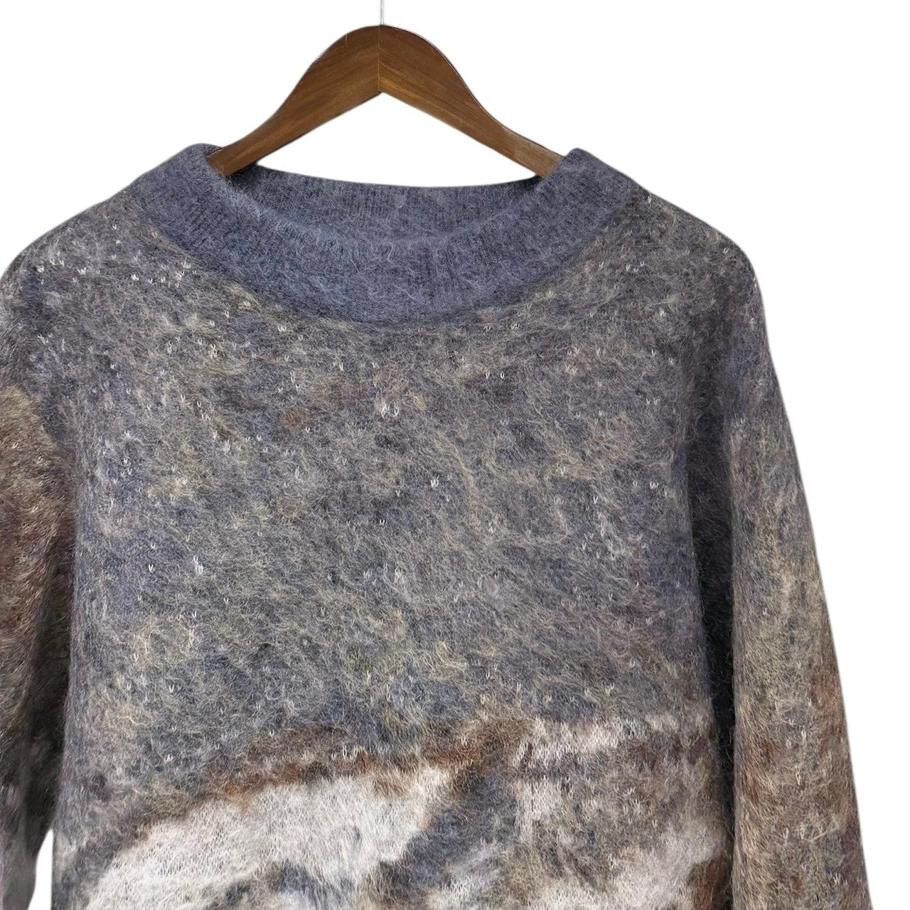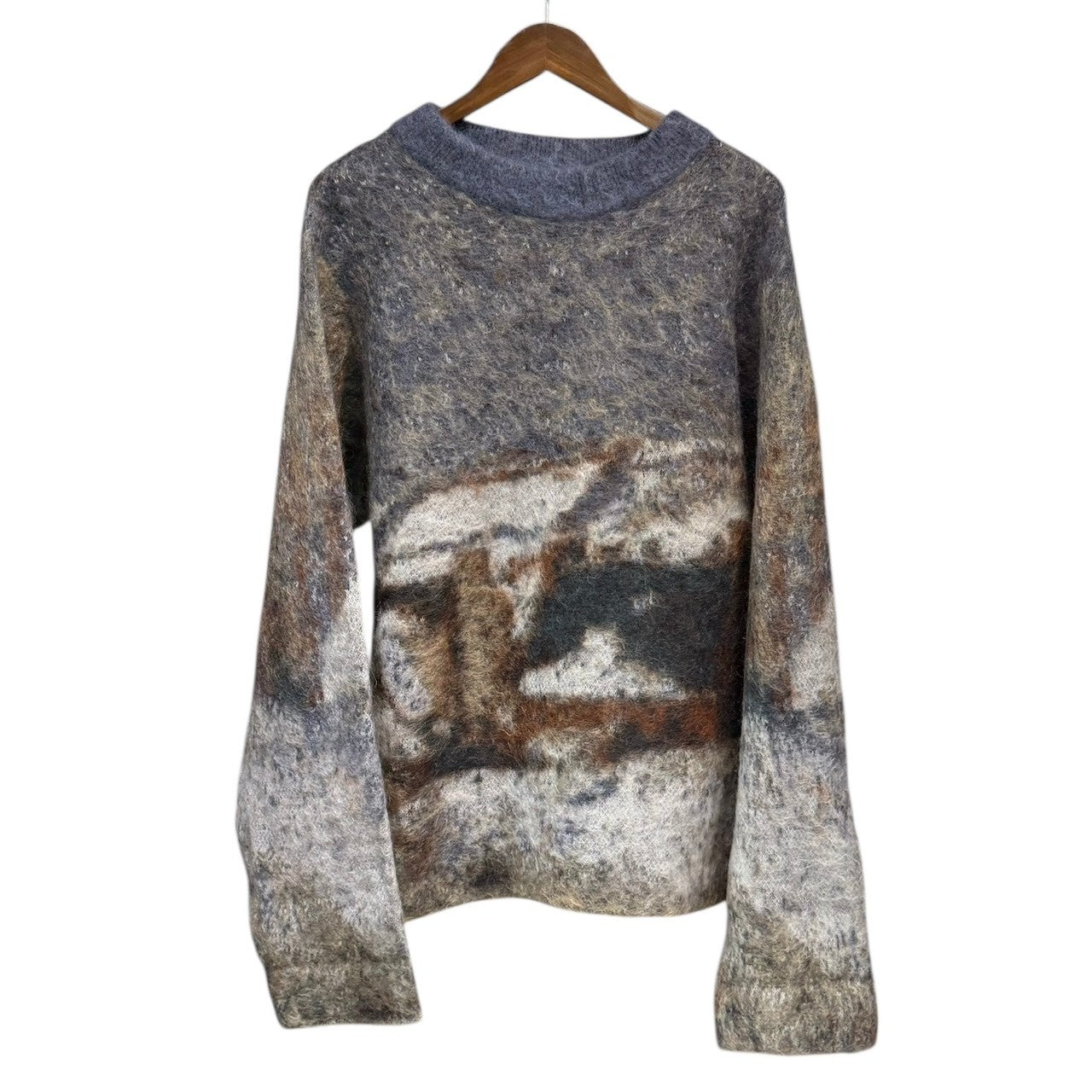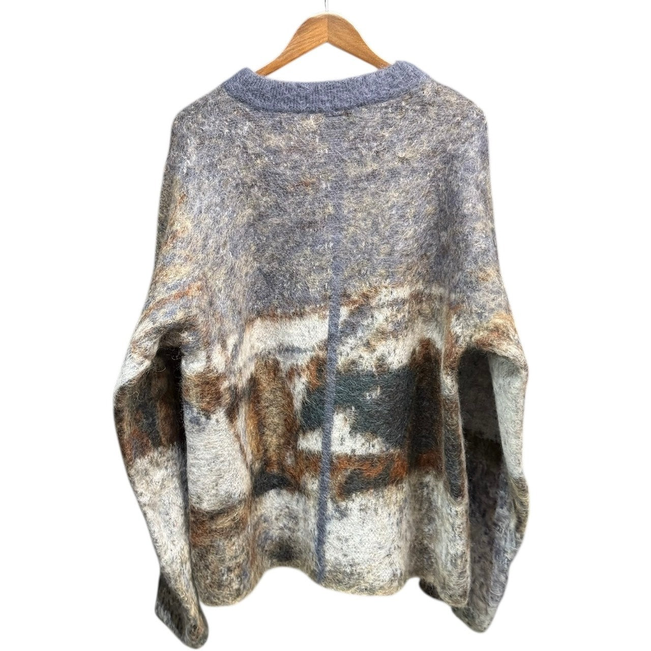 | 備考 | ゴーギャンの絵画を落とし込んだジャガードニットです。糸はチクツキの無い肌触りの良いキッドモヘアを使用し、仕上げに起毛加工を施して全体的にボカした雰囲気に仕上げています。ゆとりのある身幅のリラックスシルエットで、モックネック気味なボリュームのある襟に対し、裾と袖は敢えてリブを付けず、温かみがありつつラフな印象に仕上げた一着。参考定価:79,200円(税込)※目立った汚れはございませんが完璧を求めるかたや古着にご理解ないかたはご購入をお控えくださいませ。 |